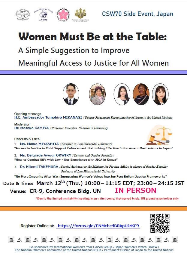 テーマ:Women Must Be at the Table:  A Simple Suggestion to Improve Meaningful Access to Justice for All Women